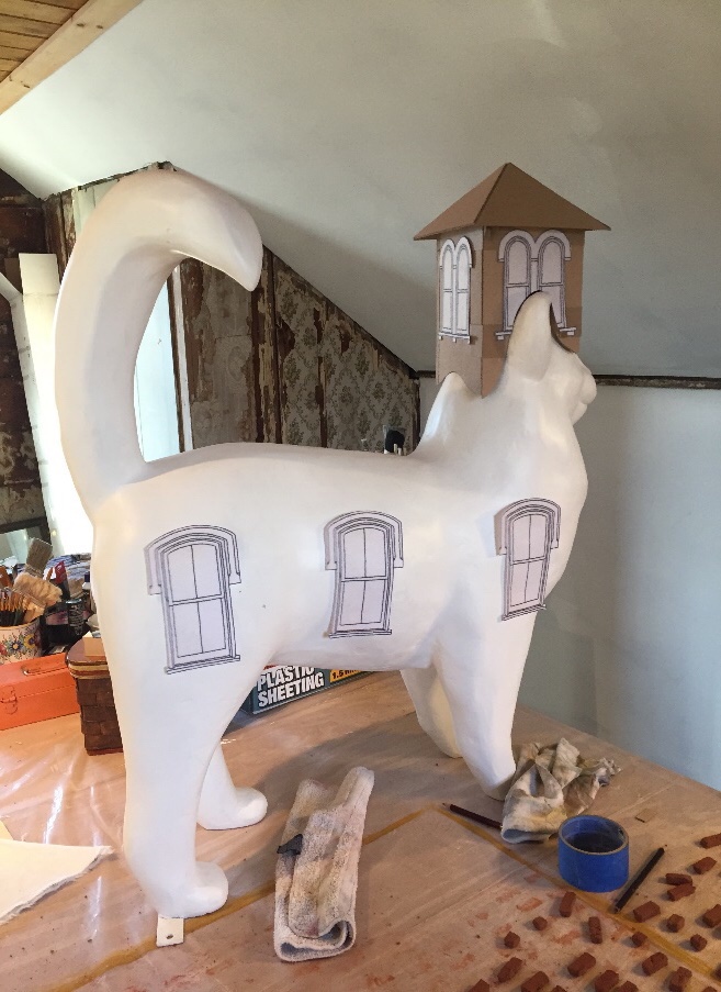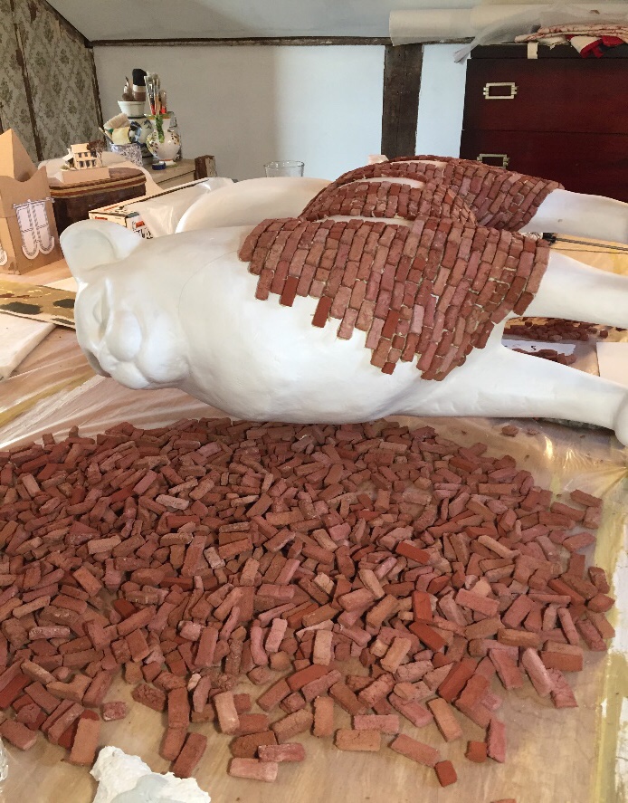 After the idea and sketch are approved, you must choose your cat. They come in two positions, sitting and standing, both with saucy expressions and ample room for an awful lot of artist material. I took my standing cat straight off the reception table at the preliminary event, and left the seated one as the sole example for other artists. I was in a hurry! I had miniature bricks to make.